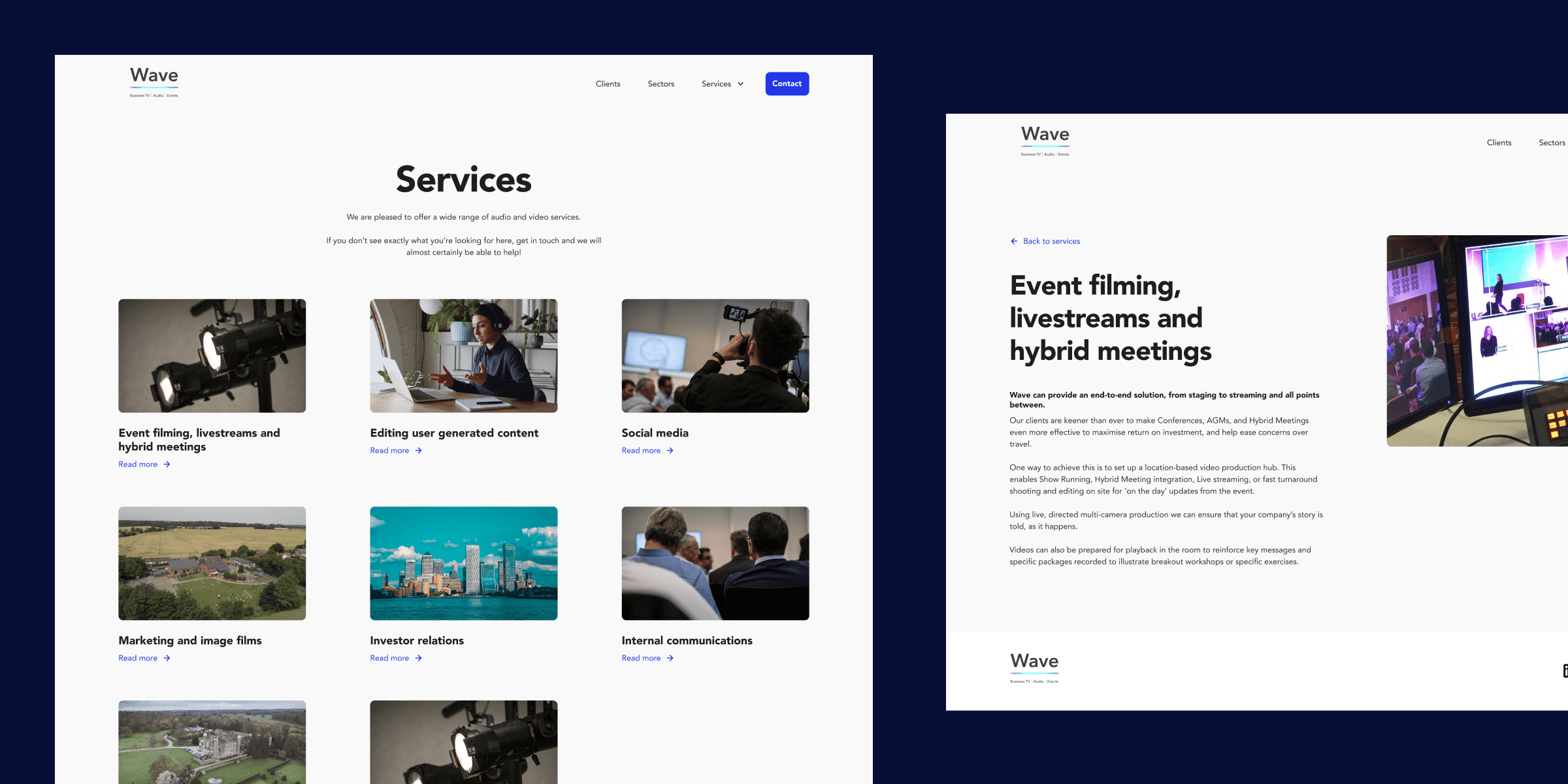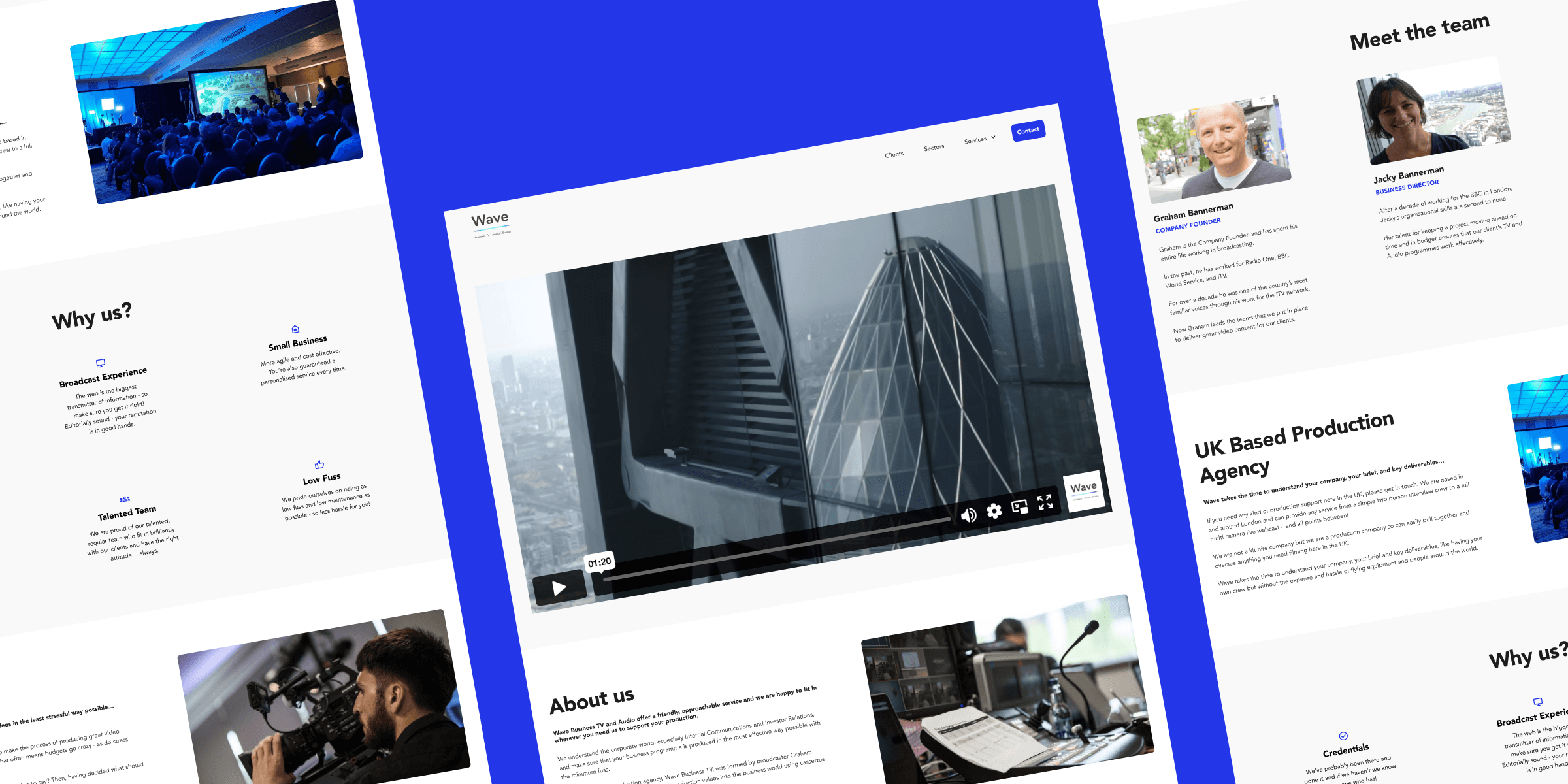 Wave is a TV and Audio production company focussed on internal communications. As they focussed largely on filming in-person events, it was tough for Wave during the pandemic as these conferences went on hold. They wanted their new site to show off their impressive client list and range of services. Their old site wasn't fit for purpose; it had a cluttered navigation, confusing structure and a misleading visual design.